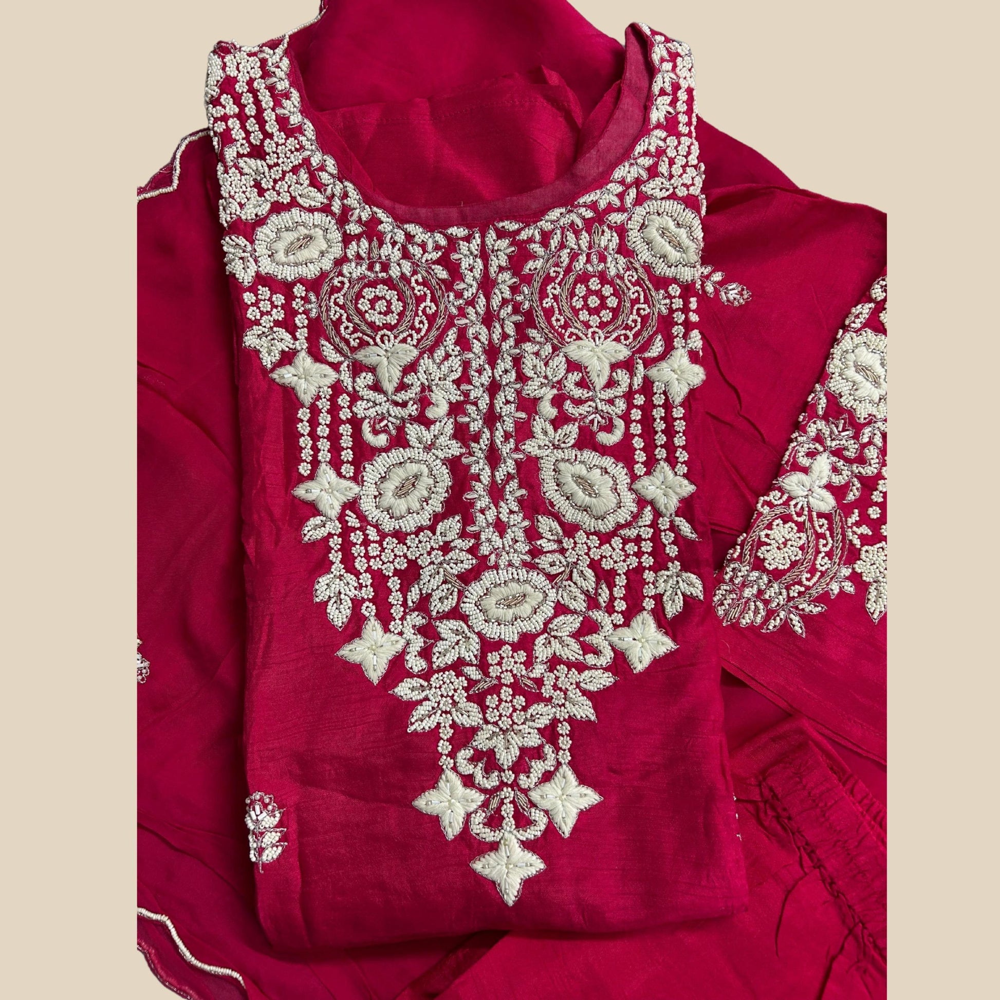 Exude timeless charm in this pink pure silk kurta set, intricately hand-embroidered with pearls, cutdana and threadwork. The elegant craftsmanship extends gracefully onto a soft chiffon dupatta, adding lightness and finesse. A perfect blend of tradition and grace, this ensemble is ideal for festive occasions, intimate gatherings or elegant celebrations.