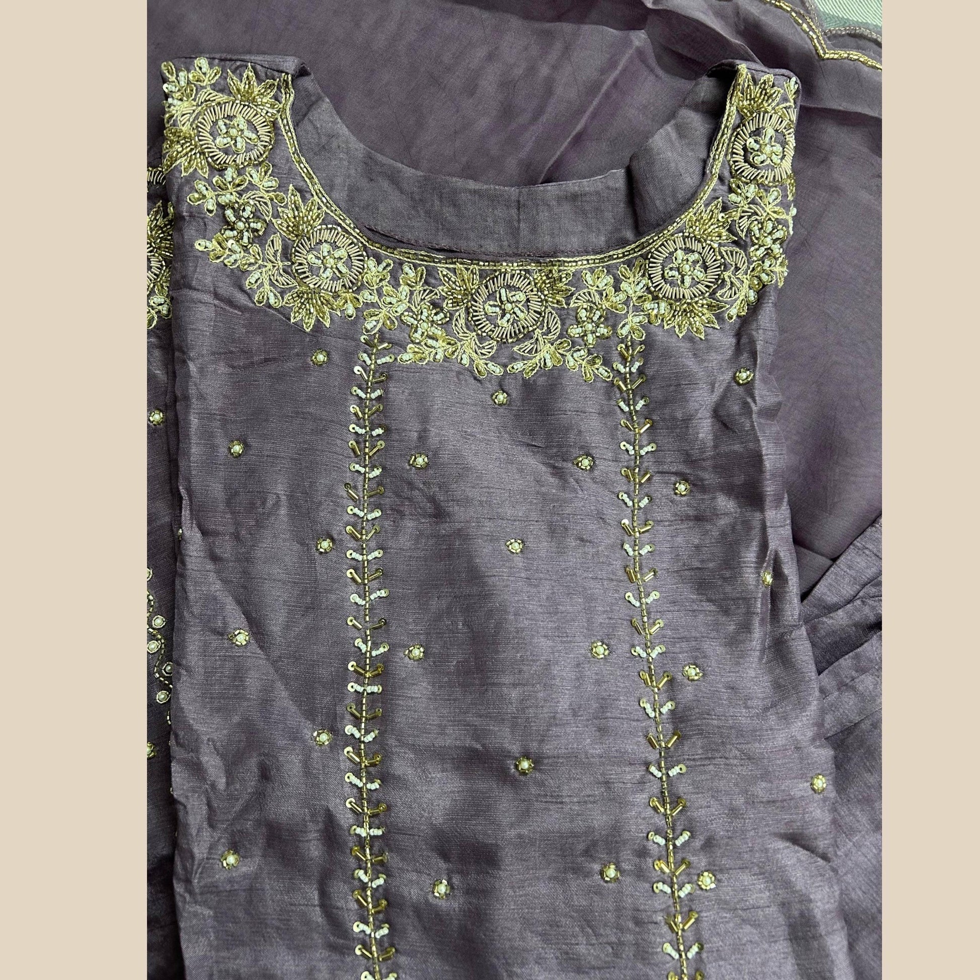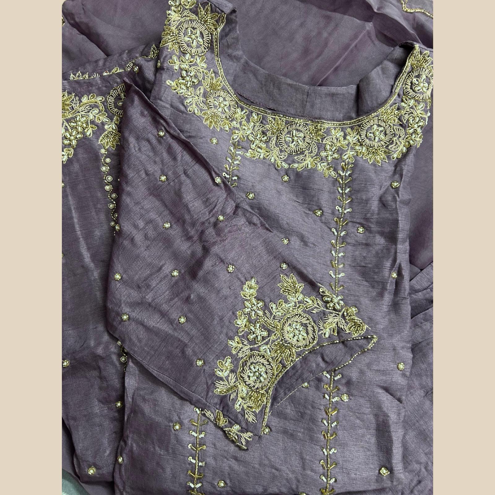 Drape yourself in elegance with this dusty lavender pure silk kurta set, hand-embroidered with delicate pearls, shimmering cutdana, thread and zari. The timeless silhouette is paired with a chiffon dupatta featuring matching intricate work, making it an ethereal ensemble ideal for festive evenings, intimate gatherings or refined celebrations.